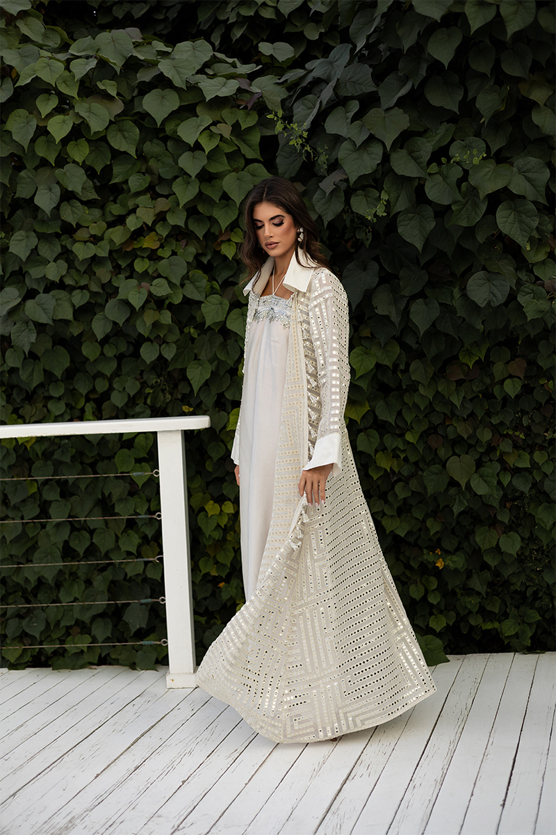 An exquisite ivory ensemble featuring a long, open jacket adorned with intricate silver foil embroidery in geometric patterns. The structured collar and cuffed sleeves lend a refined touch, perfectly balancing the soft, flowy silhouette of the inner slip dress. Elegant and contemporary, this look radiates understated glamour, ideal for festive evenings or sophisticated celebrations.