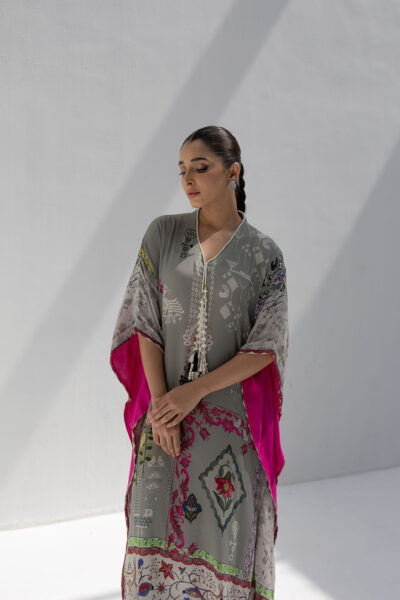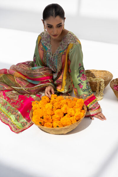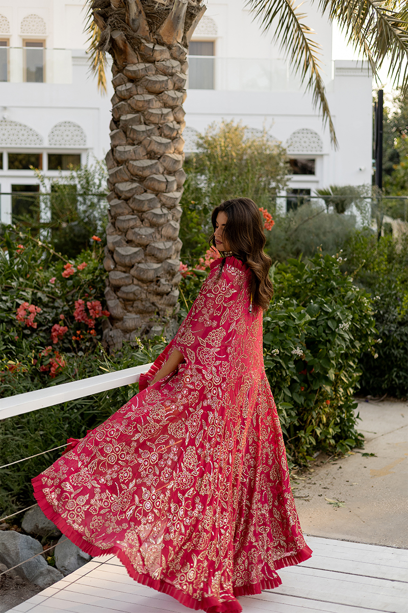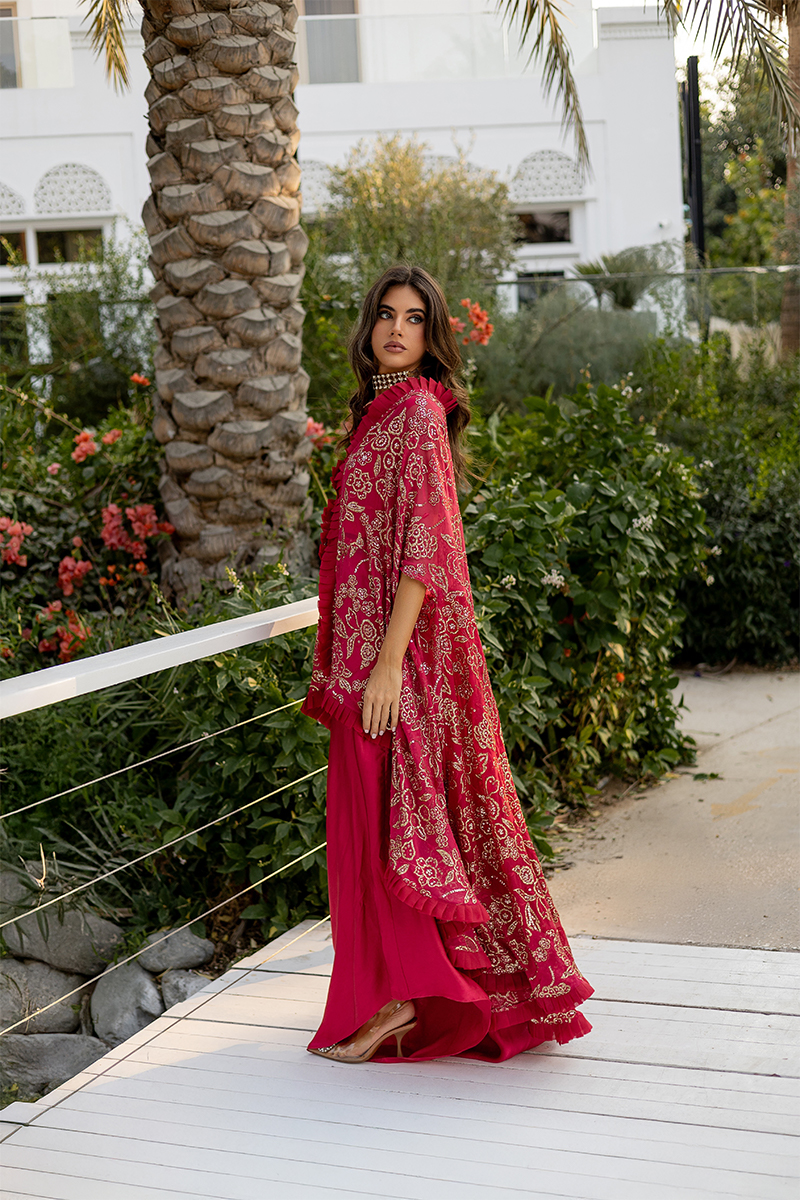 A red ensemble featuring a flowy, asymmetrical jacket adorned with intricate golden embroidery. The delicate handcrafted detailing enhances the rich hue, creating a perfect blend of tradition and modern elegance. Paired with wide-legged silk pants, the look exudes effortless grace — ideal for festive celebrations or elegant evening gatherings.