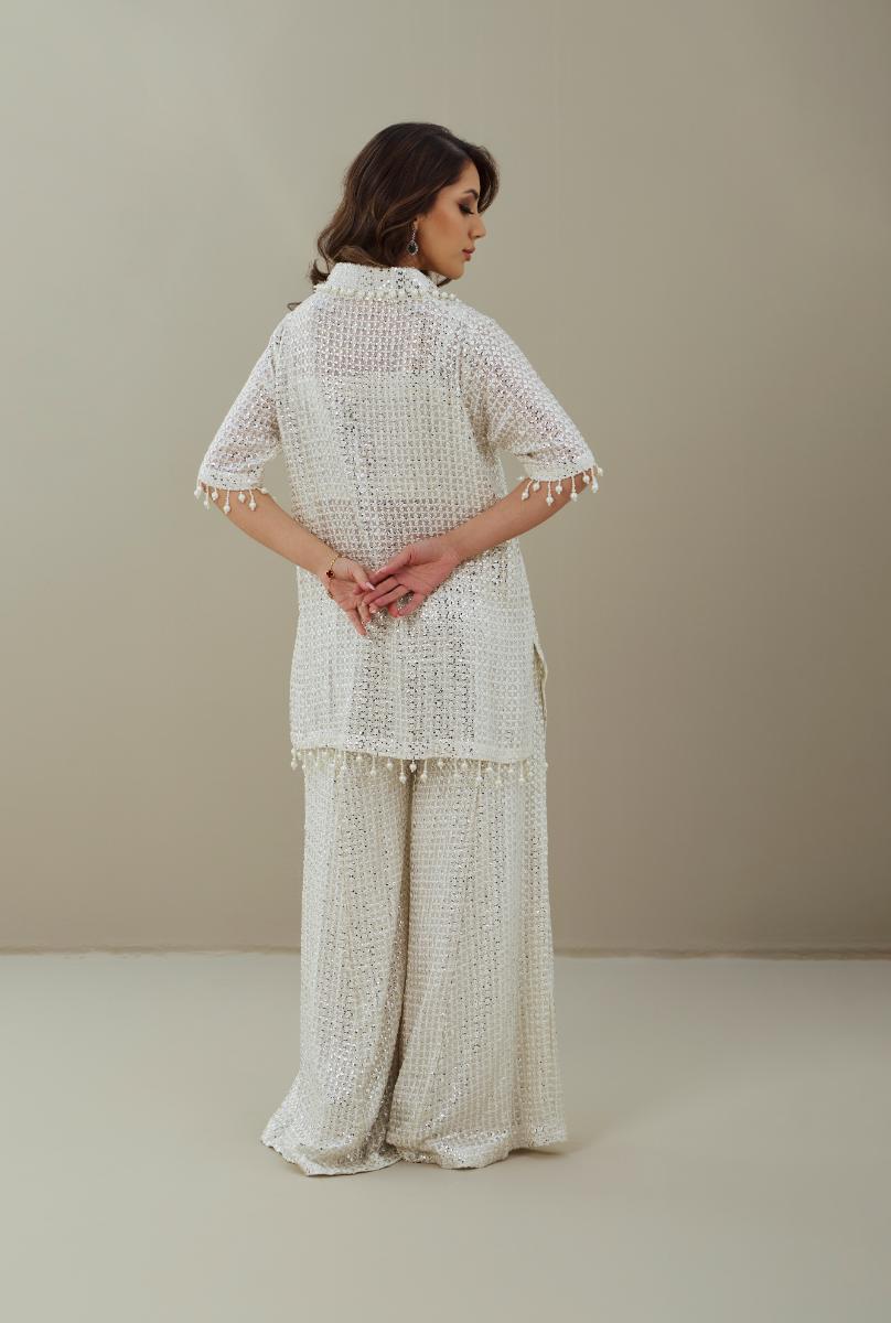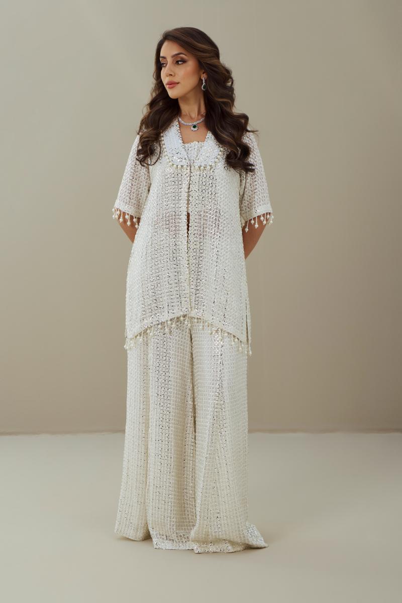 A graceful ivory ensemble featuring meticulously designed sequin motifs detailing, enhanced with delicate pearl accents along the collar, sleeves, and hem. The structured jacket and flowing palazzo pants come together in balance of texture and shimmer, creates a timeless yet modern silhouette, perfect for refined celebrations and evening wear.