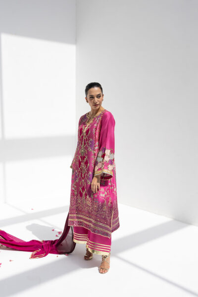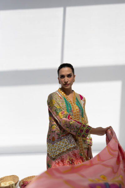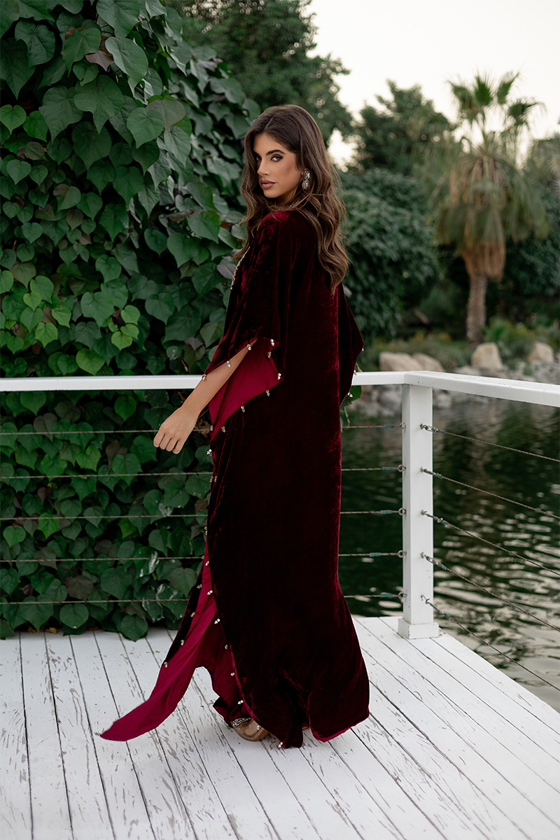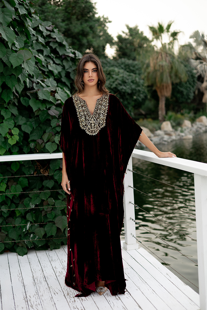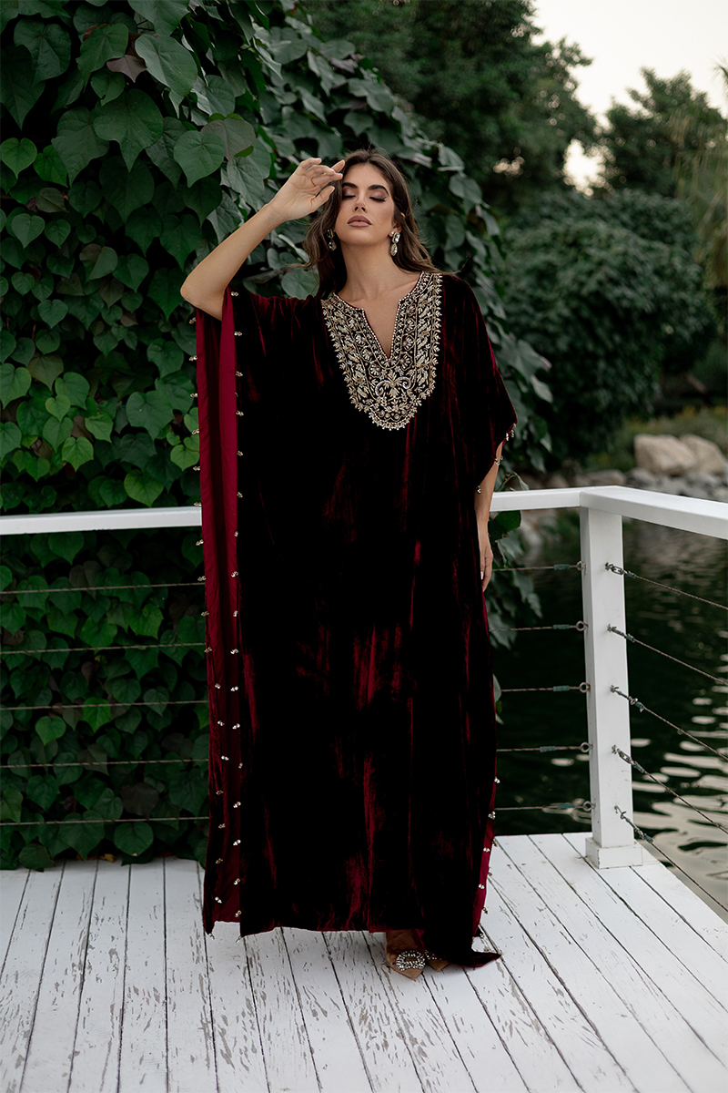 An opulent deep maroon velvet kaftan adorned with exquisite antique gold embroidery along the neckline. The intricate handcrafted detailing adds a regal touch, while the flowing silhouette drapes gracefully for a look of effortless sophistication. Perfect for winter soirées or festive evenings, this ensemble blends timeless elegance with contemporary charm.