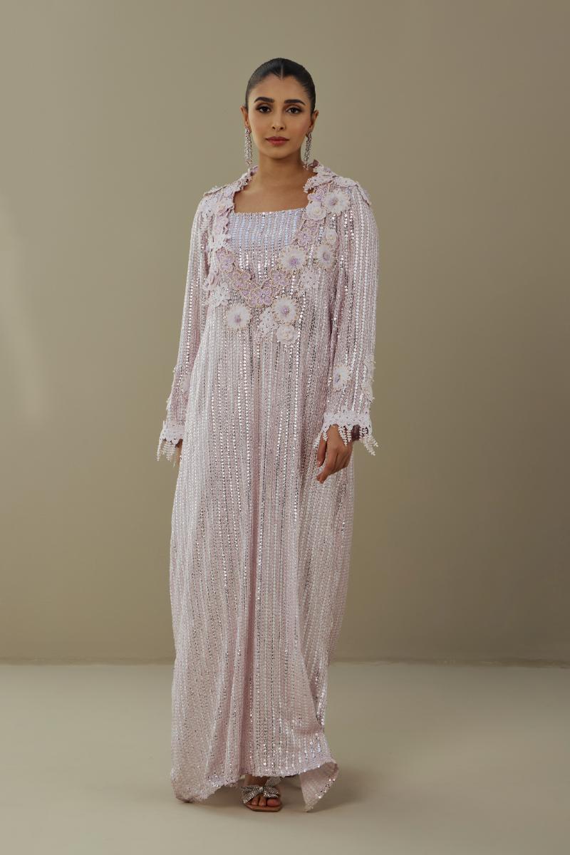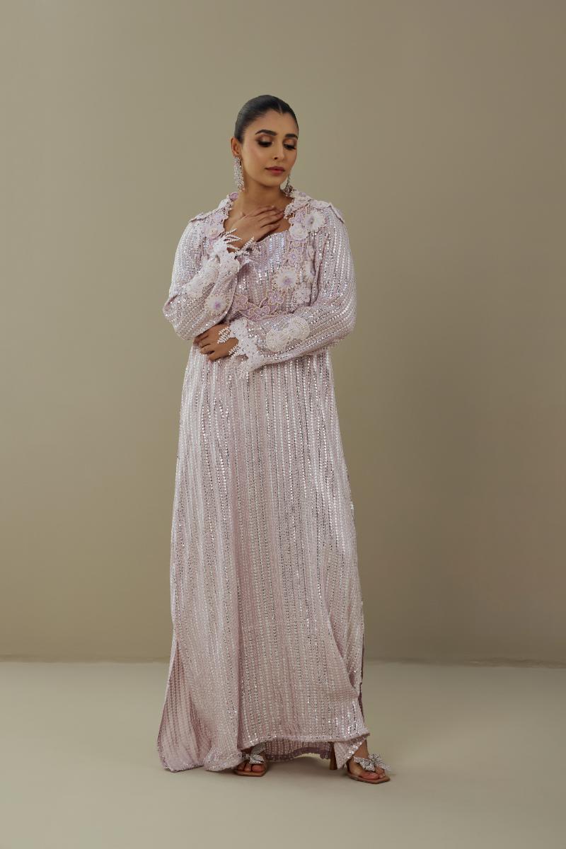 Rendered in fluid chiffon georgette, this sequin kaftan marks a refined shift in design direction. Delicately enhanced with handcrafted floral lace, enriched through detailed handwork for added texture and depth. Floral embroidered motifs, adorned with subtle pearl accents, are thoughtfully placed along the neckline and sleeves, lending a soft yet striking elegance. Designed to move effortlessly, this kaftan blends shimmer with artistry, creating a distinctive statement of modern craftsmanship and graceful sophistication.