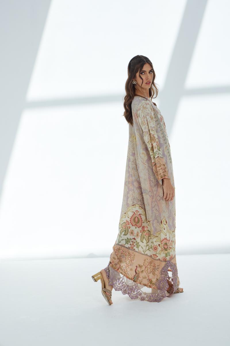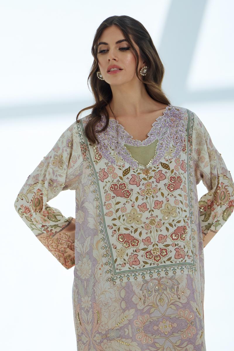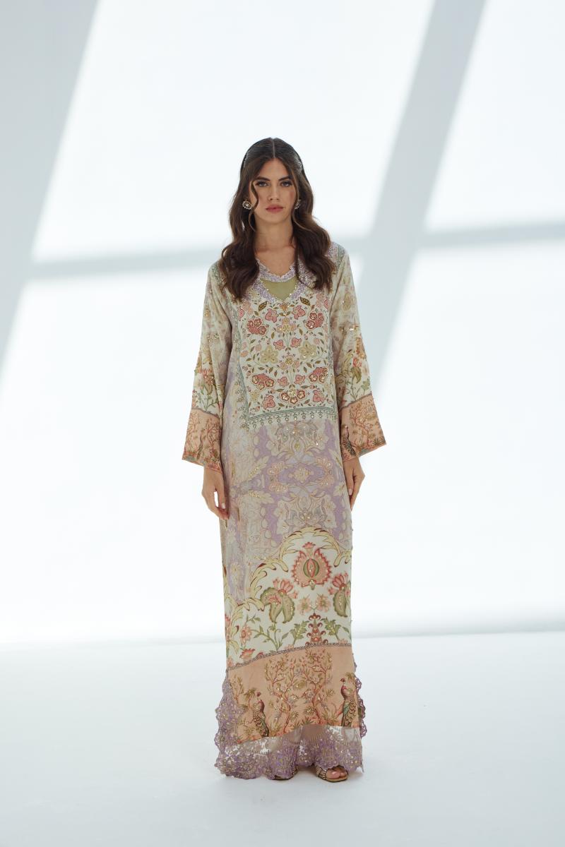 Rendered in soft shades of lilac and mauve, this printed kaftan is elevated with meticulous handwork that traces the fabric with subtle artistry. Delicate lace adorns the hem and neckline, while twin lilac-hued bunches at the collar introduce a distinctive, contemporary accent. With its flowing thoughtfully crafted details, this kaftan captures understated elegance and handcrafted sophistication.