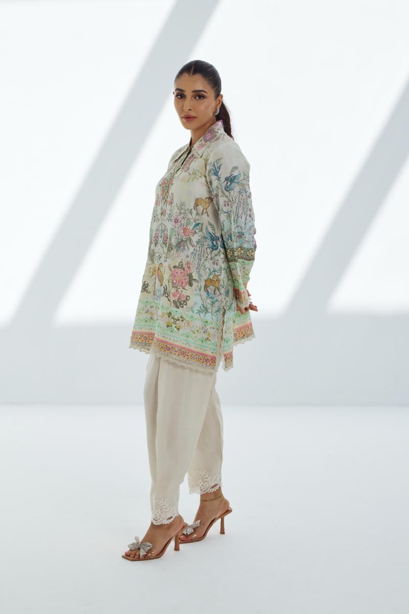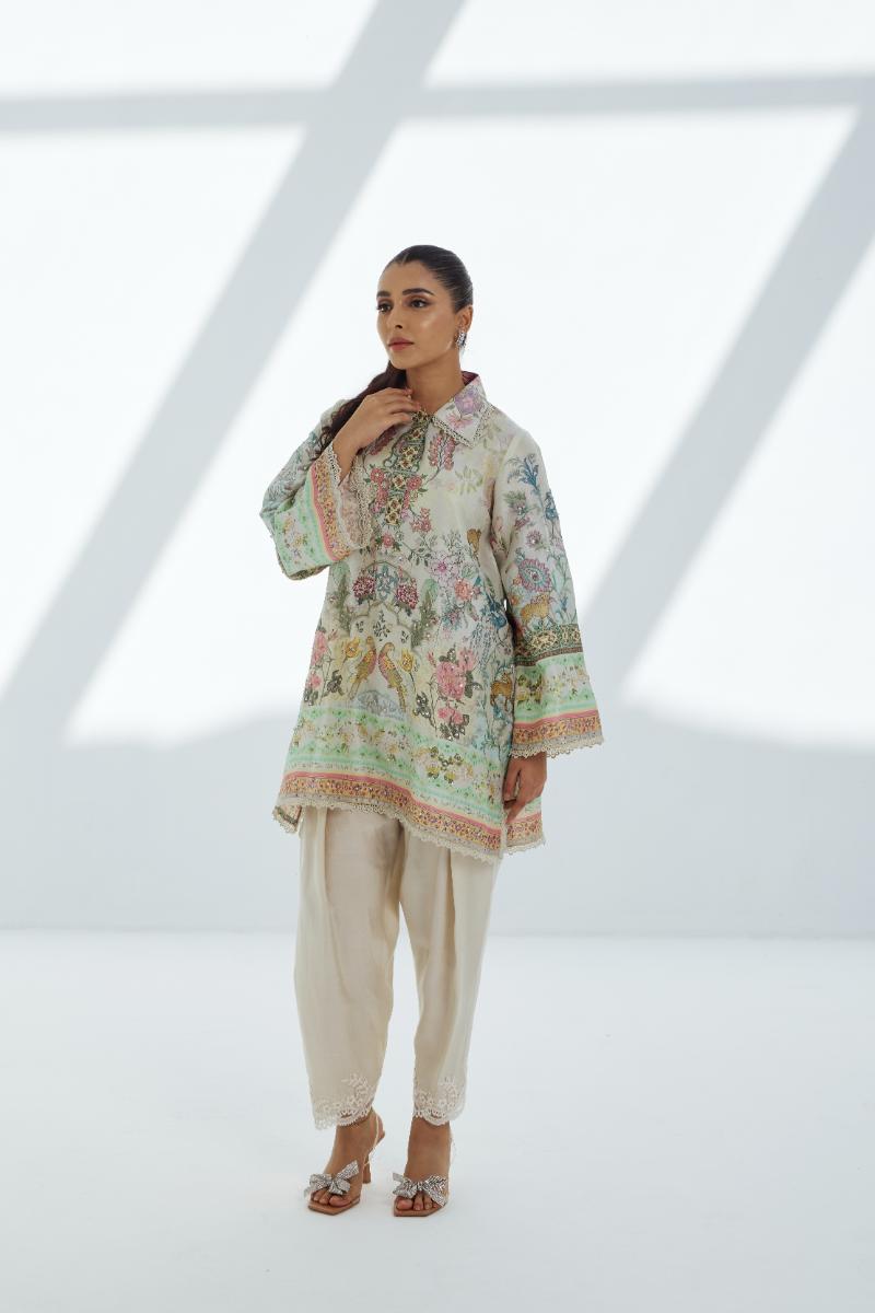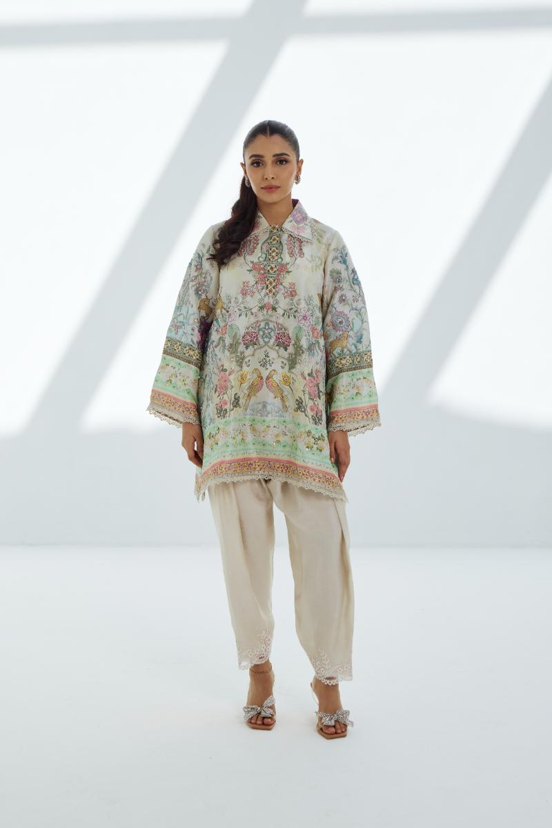 Butter yellow printed short shirt designed in modern elegance and meticulous craftsmanship. Handwork detailing on the print adds depth and sophistication, while the structured collar neckline and carefully placed lace on the hem, sleeves, and neckline create a refined finish. Designed with a slim, tailored shalwar, the ensemble presents a distinctive silhouette that balances traditional motifs with modern styling.