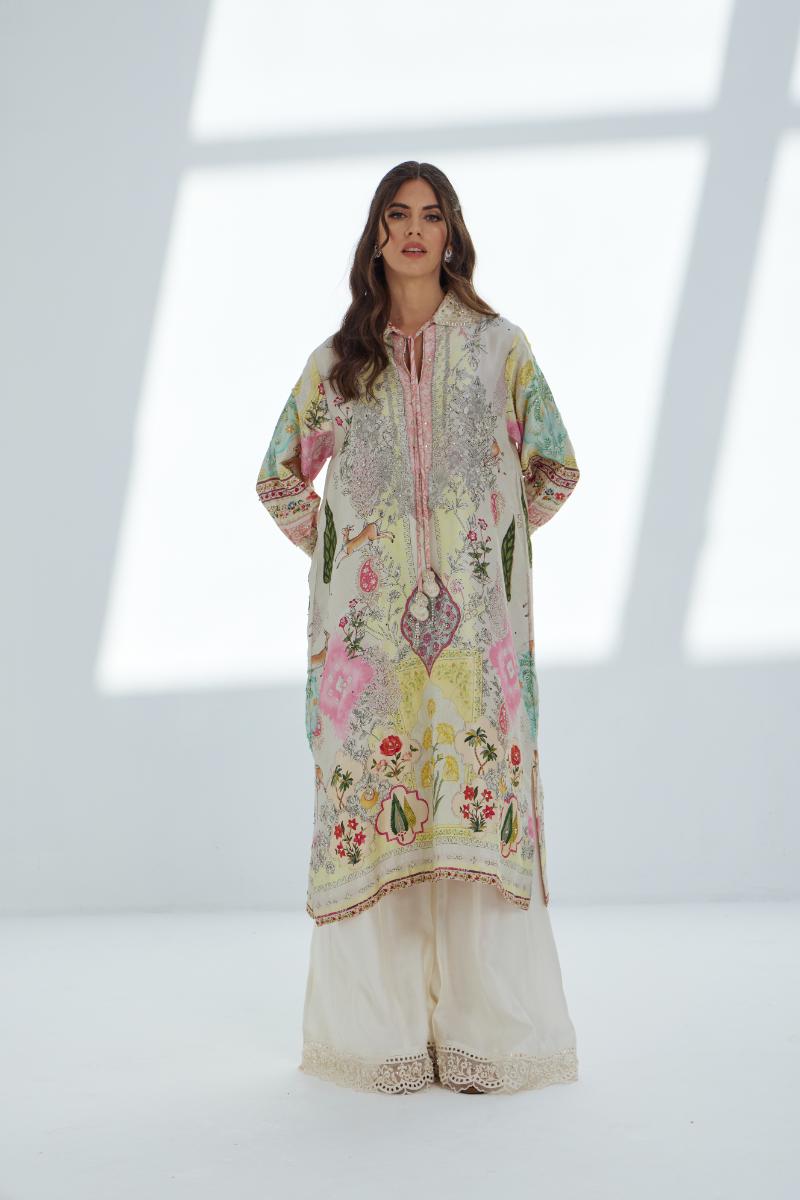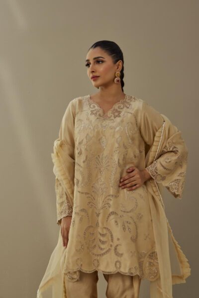 Step into effortless charm with our yellow-deer collar printed shirt, featuring handworks that adds artisanal elegance. The calf sleeves and collar neck are enhanced with delicated hand-stitched lace, while a handcrafted dori brings a unique, contemporary touch. Paired with a thoughtfully styled shalwar, this ensemble combines individuality, details, and timeless elegance with a contemporary twist.