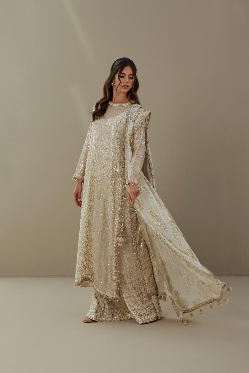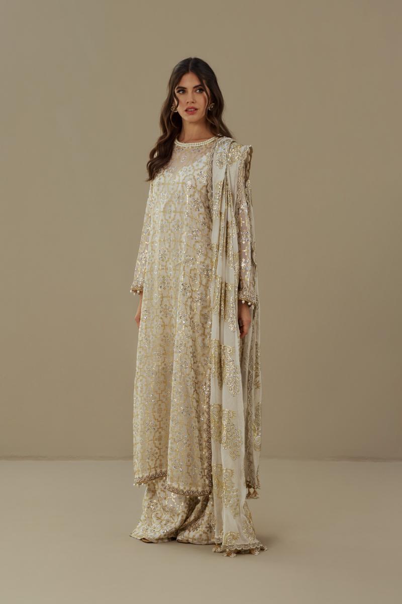 An ivory-hued long shirt and straight pant ensemble, artfully tailored in richly textured motif fabric for a harmonious and elegant profile. Flared side ties add a subtle, modern accent, while the chiffon georgette floral dupatta, adorned with shimmering petal sequins, soft pleats, and delicate lace all over, introduces fluidity and grace. The ensemble marries hand-finished detail, luxe fabrics, and refined artistry—perfect for festive evenings and grand occasions.
