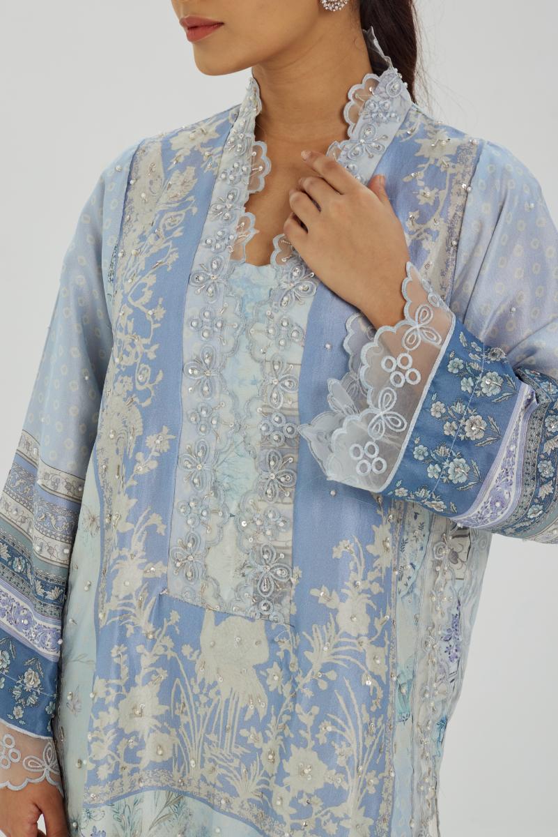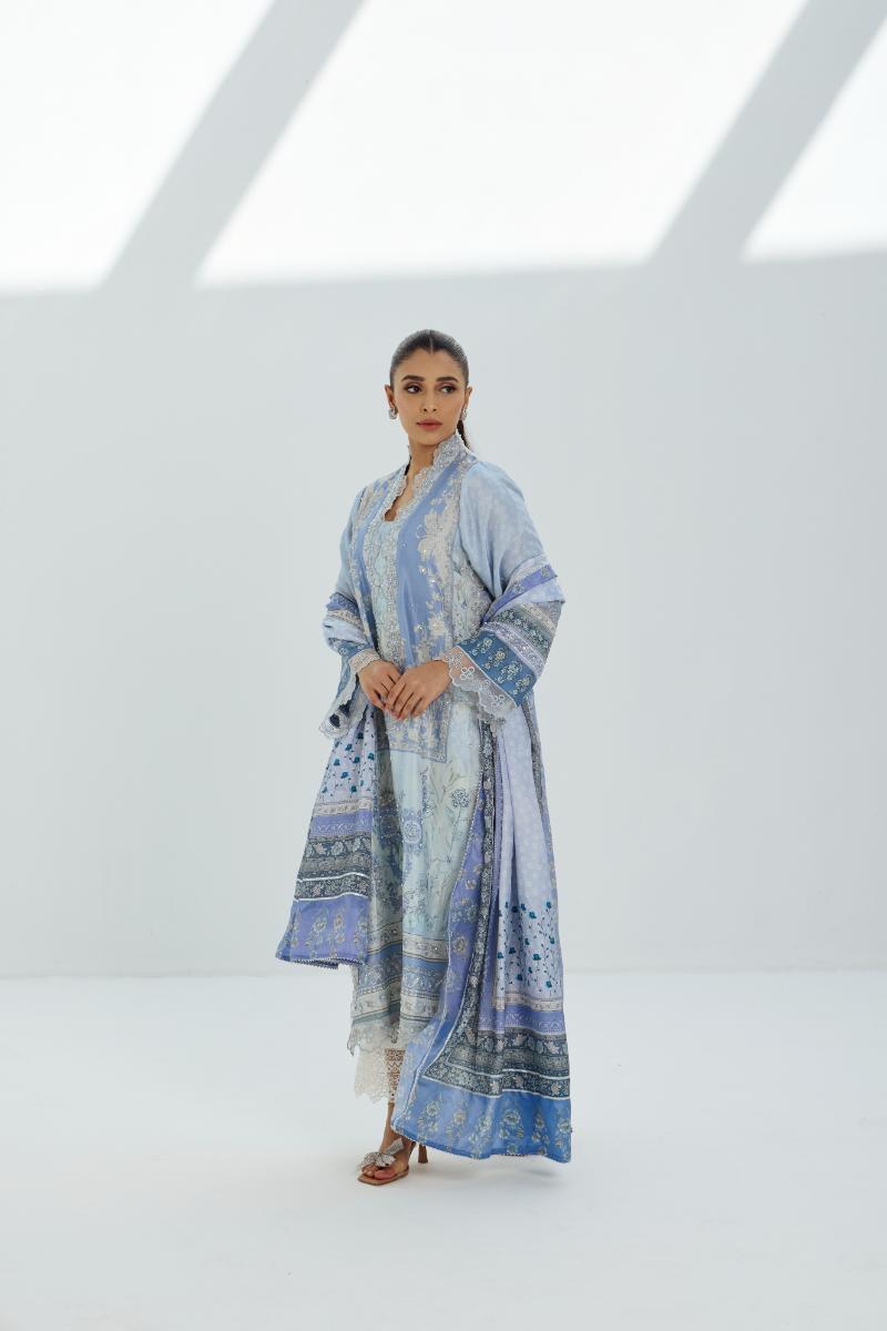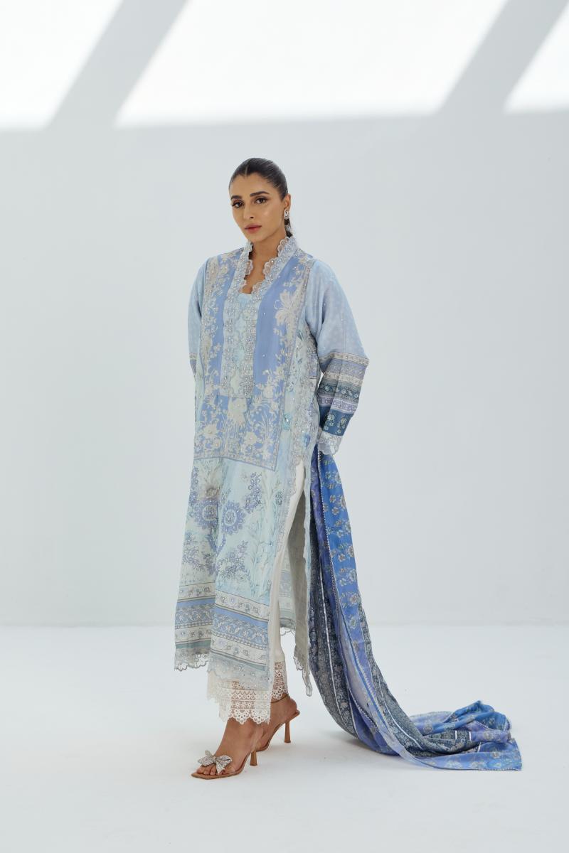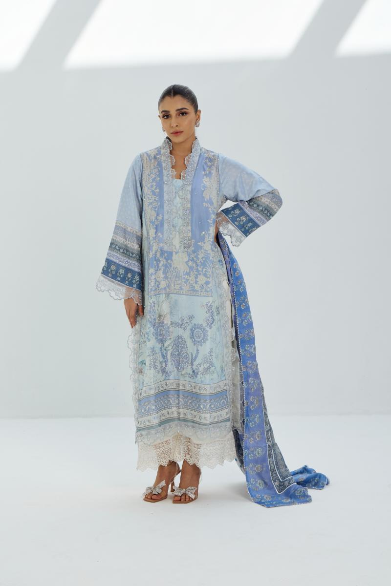 A sky-blue printed raw silk shirt unfolds with soft elegance, enriched by delicate handcrafted detailing on the shirt, neckline, sleeves, and daman, framed by delicate lace for an elevated finish. Styled with cigarette pant featuring double lace detailing, with a printed dupatta, featuring floral motifs and layered borders that add visual richness and movements.