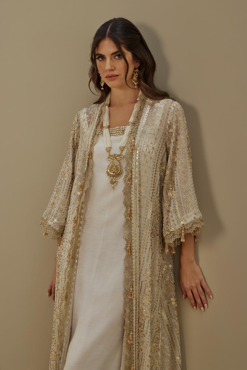 Geometric dull gold lines create a refined play of structure and shine, adding depth without overpowering the ivory base. Subtle yet striking, the muted gold detailing brings a modern edge while maintaining an understated sense of luxury.