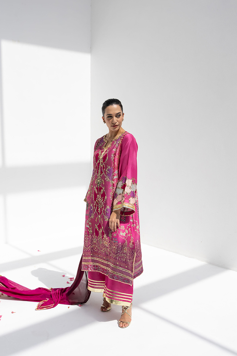 Cut from pure raw silk this pink shirt features a beautiful printed base. It is hand touched shirt with gotta , dabbka and zardozi . It is a perfect fit for all your festivity. The neckline has an intricate handworked bail. It is finished with gotta edging.