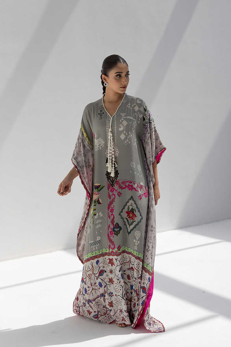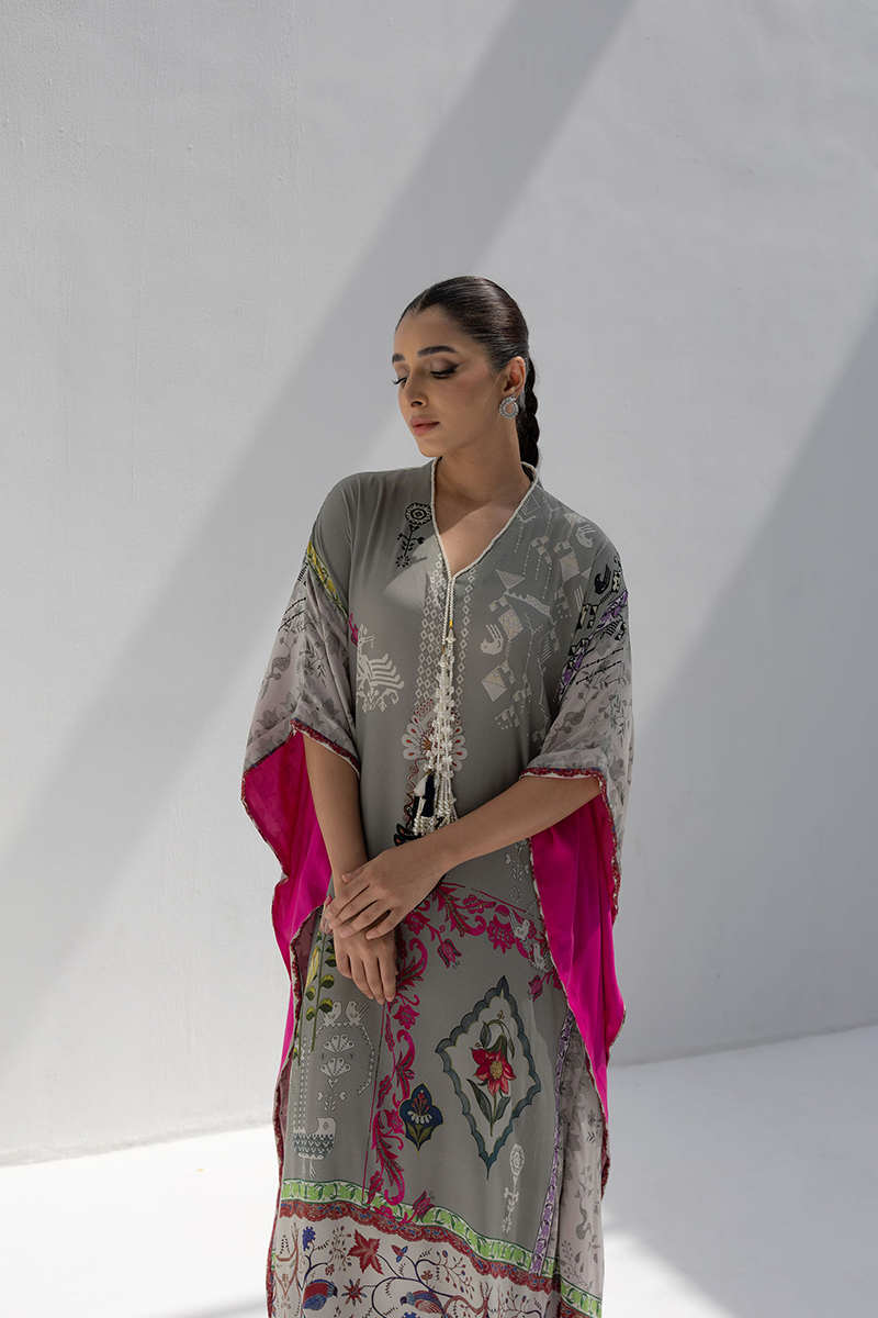 This grey kaftan is cut from pure raw silk. It features a contemporary print with hot pink accents. A perfect kaftan for the woman of today. The neckline features a pearl tassels which gives the kaftan that extra oomph .