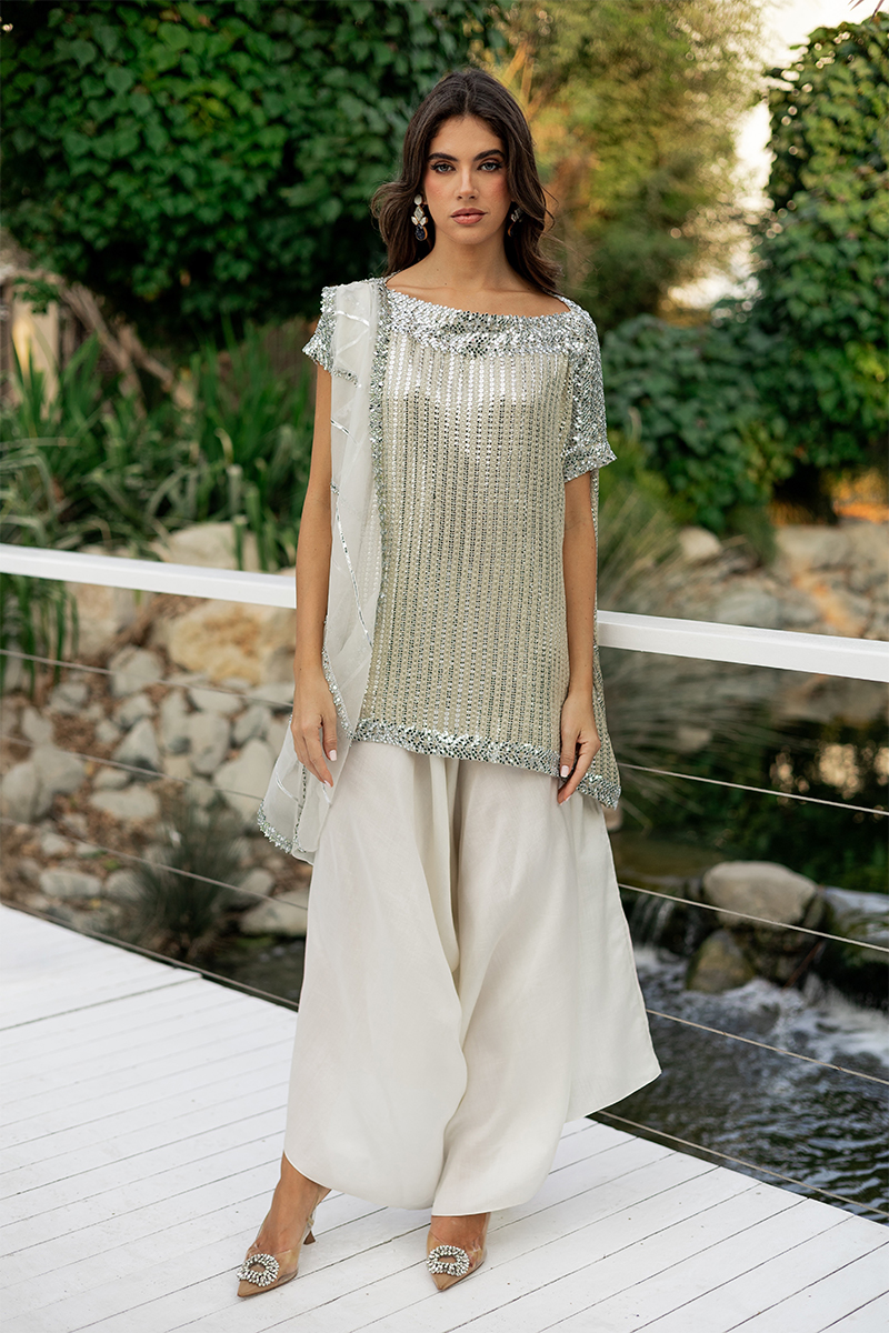 An understated statement look, our ivory sequin-embellished top paired with fluid wide-leg pants and a delicately bordered pre draped dupatta exudes effortless sophistication. The shimmering sequin detailing adds a modern edge, while the soft satin trousers and sheer dupatta bring graceful movement and timeless charm. Perfect for festive evenings or contemporary formal wear.